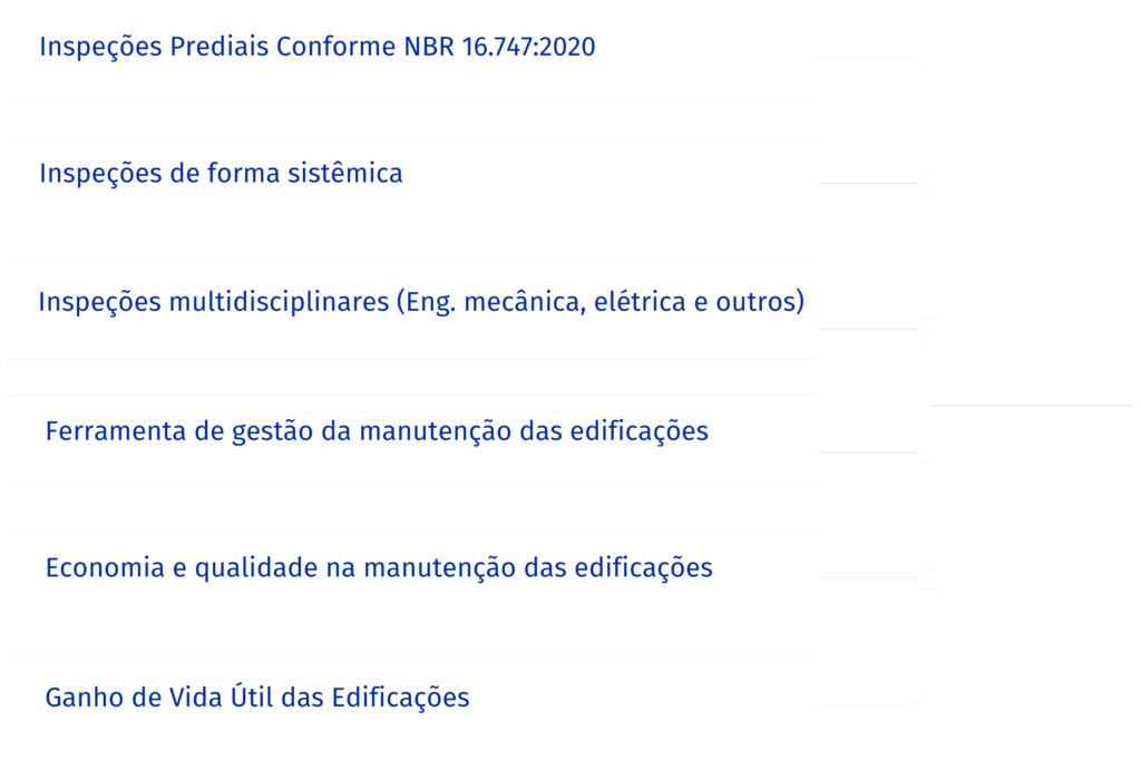 Inspeções técnicas realizadas conforme a NBR 16.747, com abordagem sistêmica e multidisciplinar, que avaliam o desempenho das edificações, orientam a gestão da manutenção e contribuem para a redução de custos, aumento da vida útil e tomada de decisões seguras.