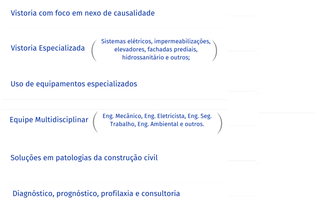 Realizamos vistorias especializadas nos principais sistemas das edificações, com foco em nexo de causalidade, uso de equipamentos técnicos e atuação de equipe multidisciplinar. Identificamos patologias, avaliamos riscos e entregamos diagnósticos completos que orientam correções, prevenções e decisões seguras.